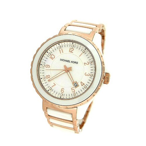 Sweet style with a loving touch by Michael Kors This watch features a rose goldtone stainless steel and white ceramic bracelet with round case a white mother-of-pearl dial with rose goldtone numerals logo and a date window The watch has a quartz movement and is water resistant to 50 meters It Read More..